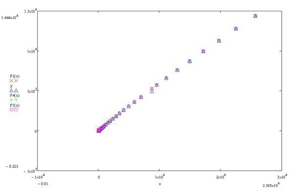 В среде MathCAD построены графики трех полученных приближающих функций в одной системе координат с исходными точками (х