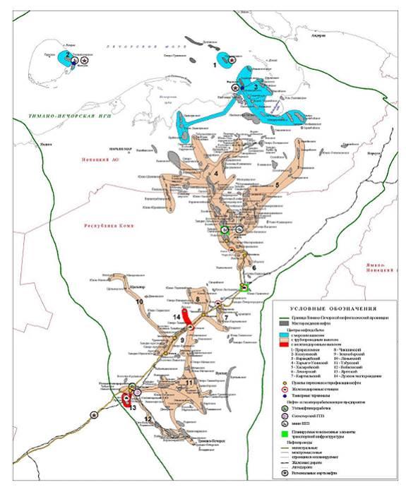 Рисунок 2 - Центры нефтедобычи Тимано-Печорской нефтегазоносной провинции