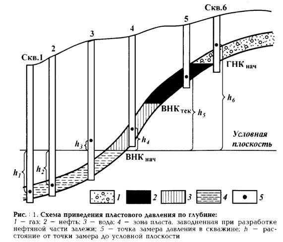 Поправку rgh вычитают при положении точки замера давления ниже условной плоскости и прибавляют при ее положении выше этой плоскости. На рис. 1 в законтурных водяных скв. 1 и 2 замеры давления произведены ниже условной плоскости, поэтому поправка должна вычитаться из замеренной величины. В водяной законтурной скв. 3 замер по техническим причинам выполнен выше условной плоскости, поэтому поправка прибавляется к значению замеренного давления. В этих трех скважинах поправку определяют с учетом плотности пластовой воды. По всем остальным скважинам замеры выполнены выше условной плоскости, поэтому поправку прибавляют к замеренным значениям, при этом учитывают плотность: по скв. 4, где пласт обводнен в процессе разработки, — воды, по скв. 5 — нефти.
