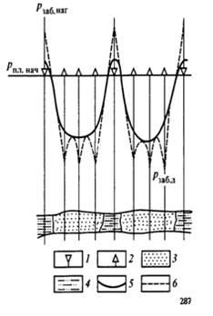 Давление в пласте у забоя скважины при ее работе называют забойным давлением Pзаб. По мере разбуривания залежи, дальнейшего ввода скважин в эксплуатацию и увеличения таким путем общего отбора жидкости из залежи воронки депрессии давления на забоях скважин сближаются, одновременно происходит постепенное снижение пластового давления в залежи в целом. Образуется общая для залежи воронка депрессии давления, осложненная локальными воронками скважин.