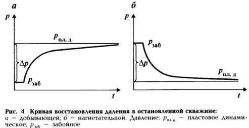 Значения забойного давления в скважине определяют в период установившегося режима ее работы, пластового — после продолжительной остановки скважин (от нескольких часов до суток и более). Для получения данных о забойном и пластовом давлении глубинный манометр спускают в скважину к середине пласта и в течение некоторого времени фиксируют забойное давление. Затем скважину останавливают, после чего перо манометра регистрирует выполаживающуюся кривую восстановления давления (КВД)