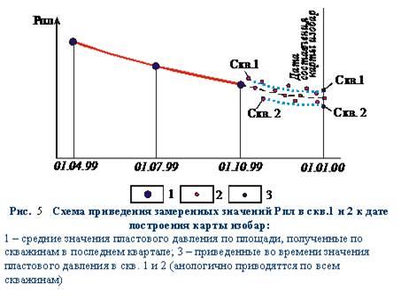 При построении карты используют данные о приведенном пластовом давлении. Для решения некоторых специальных задач могут быть построены карты абсолютного (замеренного у пласта) динамического пластового давления. При построении карты на установленную дату следует использовать замеры давления в скважинах, максимально приближенные во времени к этой дате. Однако на практике в связи с необходимостью поочередной остановки скважин для замера выполнение нужного количества измерений требует значительного времени — до одного-двух месяцев, а иногда и более. При использовании данных о давлении, полученных значительно раньше даты составления карты, необходимо в замеренные значения давления вносить поправку на время. Это можно приближенно выполнить с учетом общей тенденции снижения давления, выявленной по данным прошлых карт изобар (рис. 5, сплошная линия) и проявляющейся в периоде накопления последних данных (штрихпунктирная линия). Интервал между изобарами на карте выбирают исходя из общего диапазона значений давления в пределах залежи.