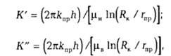 Здесь К' и К"— коэффициент продуктивности и коэффициент приемистости скважины, выражаемые соответственно в (т/сут)/0,1 MПа и в (м3/сут)/0,1 МПа и характеризующие изменение дебита и приемистости скважины на единицу изменения перепада давления в скважине. Коэффициенты К' и К." для одной и той же скважины обычно имеют разные значения. Поэтому для скважины, сначала дававшей нефть, а затем переведенной под нагнетание воды с целью совершенствования системы воздействия, эти коэффициенты должны определяться самостоятельно при добыче нефти и при закачке рабочего агента.