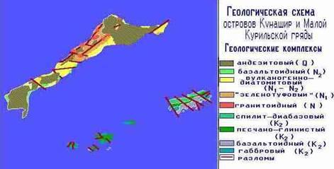 Цепь Курильских островов - это верхняя часть вулканической гряды, выступающей из воды на 1-2 км.и уходящей в глубины Тихого океана более чем на 10 км. С геологическим строением южных островов можно ознакомиться на представленных схемах.