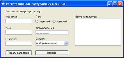 Окно для регистрации в секцию.