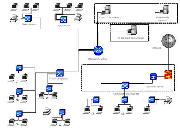 Подразделения школы соединяются в единую информационную систему при помощи управляемого коммутатора, который позволяет производить фильтрацию трафика и разграничивать доступ пользователей к ресурсам сети.