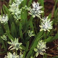 . Сходен с предыдущим видом, отличается более кожистыми и темными (почти черными) оболочками клубнелуковицы, белыми цветками, а также яркой темно-фиолетовой полоской по наружной стороне листочков околоцветника. Все органы растения несколько крупнее, чем у предыдущего вида; количество листьев – до 8, цветков – до 5. Плод до 3,8 см длиной и 1,9 см шириной, число нормально развитых семян до 87. Размножение семенное и вегетативное.