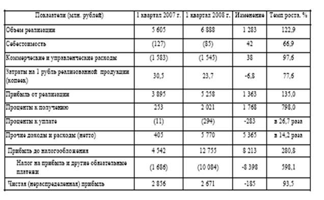 Показатели Общества за 1 квартал 2008 года Таблица 8.