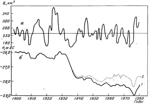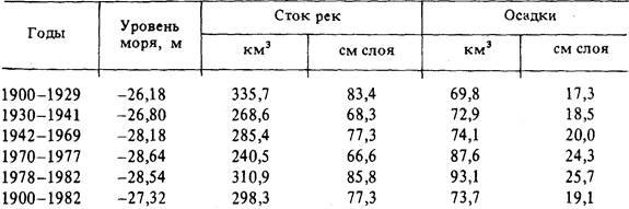 Исследование водного баланса за 1900—1982 гг. показало, что величины его приходной части почти все время были меньше, чем расходной, в основном за счет притока рек (табл. 1). Дефицит баланса, составивший в среднем 14 км3