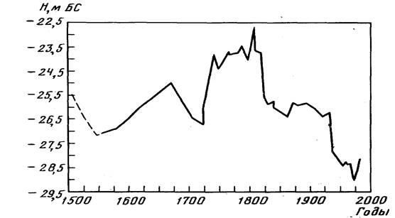Рис 2. Вековые изменения уровня Каспийского моря. 1500-1900-по Л. С. Бергу: 1901-1083 гг.-данные ГОИНа.