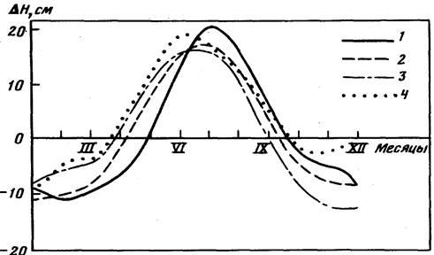 Рис 3. Среднемноголнтние внутригодовые изменения уровня Каспийского моря 1 - 1942-1955 гг., 2 - 1956-1984гг., 3 – 1970-1977гг., 4 – 1978-1984гг
