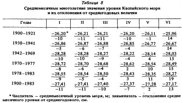 в. уровень опустился до отметки —26 м. После этого значительного снижения начался период высокого стояния уровня, и к началу XIX в. (1805 г.) его отметка достигла -22 м [Берг, 1934; Аполлов, 1951; Федоров, 1957; Николаева, Хан-Магомедов, 1962]. С начала проведения инструментальных наблюдений (1837 г.) и до начала XX в. уровень сохранял положение в среднем около —25,8 м. С 1900 по 1929 г. изменения уровня были незначительными и происходили около средней отметки —26,2 м. Это относительно равновесное положение уровня сменилось его резким снижением: с 1930 по 1941 г. оно составило 1,8 м и -было связано с крупномасштабными климатическими изменениями. В последующие годы снижение уровня Каспия происходило более медленно, а в 60-е годы наблюдалась некоторая его стабилизация около отметки —28,4 м. В первой половине 70-х годов произошло понижение уровня до экстремально низкой за последние 150 лет отметки: -29 м в 1977 г. Общее снижение с 1900 по 1977 г. составило 3 м, в том числе за счет хозяйственной деятельности — около 1 м. С 1978 г. уровень Каспия стал резко повышаться и в 1985 г. достиг отметки —27,97 м,т.е. поднялся более чем на метр.
