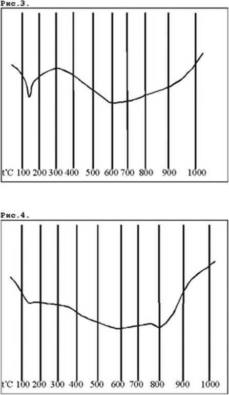 И наконец четвёртый заключительный этап при t°900 - 1000°С должно быть выделение второй порции воды, связанной с гидроксилами, и образование гематита этот процесс отсутствует в обеих случиях, тоесть глауконит згарает и при згарании не выделяет гематита. Но при (-) t°800°C, как видно из кривой на рисунке 4, происходит процесс выделения карбонатов, а на кривой рисунка 3 этот процесс не наблюдается.