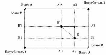 В точке Е потребитель 1 обладает некоторым количеством блага А - А1 и некоторым количеством блага В - В1, которые мы и отложим на соответствующих осях. В этой же точке потребитель 2 обладает количествами благ А2 и В2. Потребители совершили обмен и перераспределение благ стало соответствовать точке Е'. Соответственно, потребитель 1 обменял определенное количество блага А на благо В и стал обладать новой комбинацией благ: А'1 и В'1, у потребителя 2 наоборот - увеличилось количество блага А (стало А'2) и уменьшилось количество блага В (стало В'2).