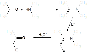 в некоторой степени обладает кислотными свойствами, и в сильнощелочной среде реакция по гетероатому может конкурировать с основной. Особенно выделяются вторичные енамины, которые после N-депротонирования выступают как весьма активные N-нуклеофилы:
