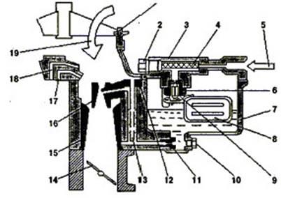 Рисунок 1. Схема главной дозирующей системы карбюратора К-135: 1 - входной воздушный патрубок;2 - пробка топливного фильтра;3 - крышка поплавковой камеры; 4 -топливный фильтр; 5 - вход топлива от бензонасоса; 6 - клапан поплавковой камеры; 7 - корпус поплавковой камеры; 8 - поплавок; 9 - игла клапана поплавковой камеры; 10 - пробка главного топливного жиклера; 11 - главный топливный жиклер; 12 - главный воздушный жиклер; 13 - эмульсионная трубка; 14 - дроссельная заслонка; 15 - большой диффузор; 16 - малый диффузор; 17 - распылитель экономайзера; 18 - распылитель ускорительного насоса; 19 - вход воздуха