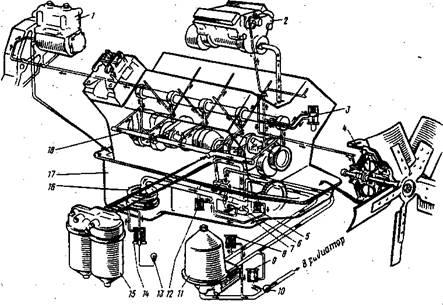 Из картера 17 масло через маслоприемник 16 поступает в нагнетающую и радиаторную секции масляного насоса 7. Из нагнетающей секции через канал в правой стенке блока цилиндров масло идет в полнопоточный фильтр 15, где оно очищается двумя фильтрующими элементами. Очищенное масло: подается в главную магистраль 18, а оттуда по каналам в блоке и головках цилиндров - к коренным подшипникам коленчатого вала, подшипникам распределительного вала, втулкам коромысел и верхним наконечникам штанг толкателей. От коренных шеек по отверстиям внутри коленчатого вала масло поступает к шатунным подшипникам. Со стенок цилиндра оно снимается маслосъемным кольцом, отводится в поршень и смазывает опоры поршневого пальца в бобышках и втулку верхней головки шатуна. Через каналы в задней стенке блока цилиндров и картера маховика масло под давлением поступает к подшипникам компрессора 1, а через каналы в передней стенке блока – к подшипникам топливного насоса высокого давления 2. Поступающим из главной магистрали маслом смазывается выключатель 3 гидромуфты привода вентилятора. При открытом кране 10 масло поступает из центробежного фильтра в радиатор, после чего сливается в картер 17.