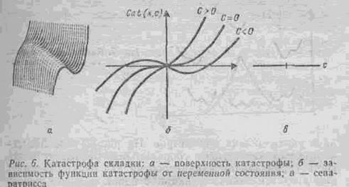 измерений. Поверхность простейшей катастрофы с одной переменной состояния и одним управляющим параметром приведена на рис. 6, а. Она имеет вид складки на ткани и называется катастрофой складки. Функция катастрофы в этом случае задается канонической формой . Соответствующие кривые для фиксированных значений параметра с приведены на рис. 6, б. При с