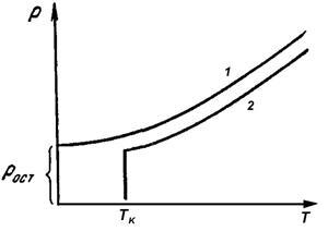У большой группы металлов и сплавов при температуре порядка нескольких градусов Кельвина сопротивление скачком обращается в нуль (кривая 2