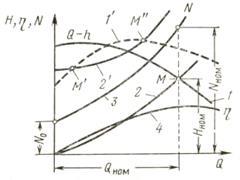 . Работа вентилятора в неустойчивом режиме недопустима, т.к. сопровождается колебаниями давления, подачи и потребляемой мощности ( кривая 3 ).