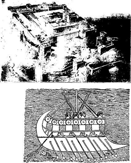 Не везде встречаются значительные озера; если, однако же, люди селились в таких местностях, где не было большой воды, они повторяли привычный способ постройки. Так появились свайные деревни на земле: их выстраивали близко к реке, где она могла заливать берег, или на лесных полянках, где вырублены были деревья. Деревню, построенную на земле, огораживали для защиты рвом и валом; вал делали из косо накрест вбитых свай, на которые наваливали землю; изнутри к насыпи приставляли еще длинные бруски, промежутки между ними наполняли глиной и связками хвороста, а сверху делали накат из песка и камня. Выходила четырехугольная крепость, обращенная боками к четырем странам света. Избушки на помостах были небольшие, в полторы или две сажени* ширины, из прямых балок, перевитых сучьями и хворостом и обмазанных сырой глиной. Печей и труб не было; по-прежнему среди жилья зажигали костер; дым от него выходил в отверстие, сделанное наверху или сбоку. Жилище разделялось на две половины; в одной держали скот, в другой жили люди; здесь посредине делалась каменная настилка для костра.