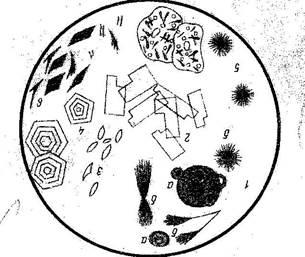 Эритроциты дифференцируют с кристаллами оксалата кальция овоидной формы и дрожжевыми клетками. Дрожжевые клетки овальной формы, голубоватого цвета и резко преломляют свет. Микрохимические реакции проводят на предметном стекле, смешивая одну каплю осадка и одну каплю уксусной или соляной кислоты. Добавленная к осадку 30% уксусная кислота гемолизирует эритроциты и не изменяет оксалаты и дрожжевые клетки. Азур-эозин окрашивает эритроциты в розовато-сиреневый цвет, дрожжевые клетки в черный. Овоидные оксалаты растворяются полностью при добавлении к осадку капли концентрированной соляной кислоты.