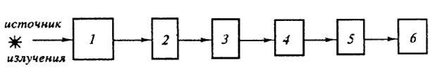 Спектральные приборы, основанные на фотоэлектрическом принципе регистрации спектров, называются спектрометрами (спектрофотометрами). Они получили широкое распространение. Спектрометр состоит из следующих основных узлов: источника излучения, монохроматора 1, кюветного отделения 2, анализатора 3, приемника излучения 4, усилителя 5, регистрирующего устройства 6.