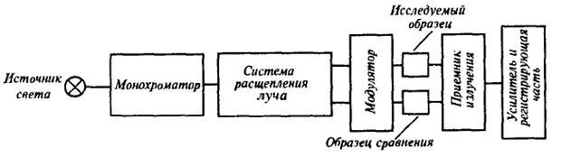 После монохроматора с помощью системы расщепления луч света делится пополам, а затем через модулятор попадает на образец и эталон. На фотоприемник поочередно направляются лучи, проходящие через образец и эталон. При этом чаще всего используется дифференциальный метод регистрации поглощения или пропускания исследуемого образца относительно эталона. Изменяя длину волны света с помощью монохроматора, получают спектр поглощения исследуемого образца.