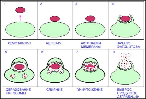 Фагоцитоз – явление поглощение и переваривание клеткой корпускулярного материала – бактерий, крупных вирусов, отмирающих собственных клеток организма и чужеродных клеток. Случайный контакт фагоцита с микробной клеткой приводит к тому, что фагоцит поглощает микробную клетку и за счет гидролитических ферментов происходит полное или частичное разрушение патогенна (см. приложение)