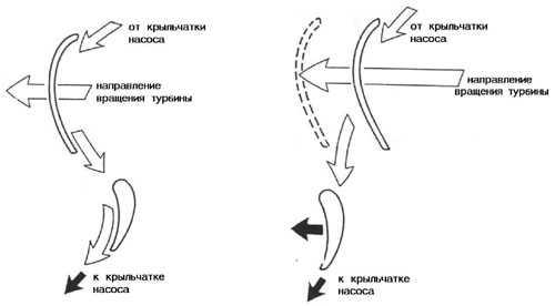 Для иллюстрации принципа действия ГТ как элемента, передающего крутящий момент, воспользуемся примером с двумя вентиляторами (рис.3). Один вентилятор (насос) включён в сеть и создаёт поток воздуха. Второй вентилятор (турбина) - выключен, однако, его лопатки, воспринимая поток воздуха, создаваемого насосом, вращаются. Скорость вращения турбины меньше, чем у насоса, она как бы проскальзывает по отношению к насосу. Если применить этот пример по отношению к ГТ, то в нём в качестве вентилятора, включённого в сеть (насоса), выступает крыльчатка насосного колеса.