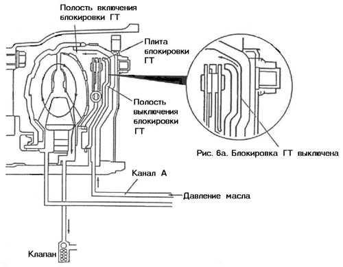 При достижении автомобилем высокой скорости по особой команде от устройства управления АКП поток масла изменяется так, что он прижимает блокировочную плиту вправо к корпусу ГТ (см. рис. 6б