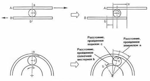Рассмотрим простой пример. На рис. 8 показан шарик С между досками А и В. Доска В зафиксирована неподвижно, а доска А двигается в направлении, показанном стрелкой. В этом случае шарик с двигается в том же направлении, что и доска А, только медленнее её. Если применить этот пример к планетарному ряду, то в качестве доски А выступит эпицикл, в качестве доски В - солнечная шестерня и в качестве шарика С - сателлиты. Если зафиксировать солнечную шестерню и повернуть эпицикл в направлении стрелки, сателлит будет вращаться в том же направлении, что и эпицикл. Однако, как и в случае с досками и шариком, сателлит вращается медленнее, чем эпицикл. Такое соотношение скоростей вращения эпицикла и сателлитов в планетарном ряду АКП осуществляется на второй передаче