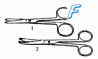 . 1 — остроконечные прямые ножницы; 2 — тупоконечные изогнутые ножницы.
