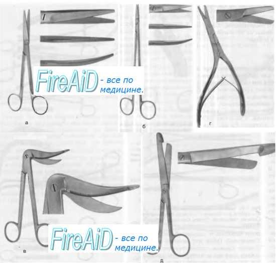 , а — стандартная модель Мейо, б — сосудистые ножницы Келли, в — ножницы Марбаха для зпизиотомии, г — ножницы Каплана для рассечения перегородок, д — анатомические ножницы для знтеротомии.