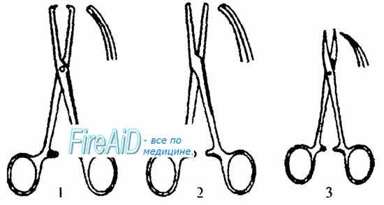 . 1 — зажим Кохера; 2 — зажим Бильрота; 3 — зажим «Москит».