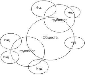Правовое сознание общества. В нем закрепляется типичные устойчивые взгляды на право и его институты, существующие в данном обществе. Лишь на этом уровне окружающая правовая действительность отражается в целом и все сторонне. Можно изобразить общественное сознание с помощью круговых схем Эйлера.