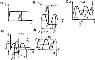 С точки зрения изменения напряжений во времени их можно разделить на постоянные и переменные (рис. 1.1). Переменные напряжения могут быть симметричными (рис. 1.1,б), асимметричными, знакопостоянными (рис. 1.1, в), знакопеременными (рис. 1.1, г) или пульсирующими (рис. 1.1, д).