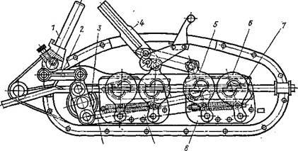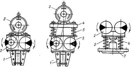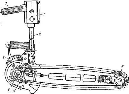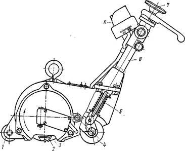 Регулирование толщины снимаемой стружки осуществляется поднятием или опусканием оси ротора при помощи тяги 5, перемещаемой гайкой 7. На рукоятке 6