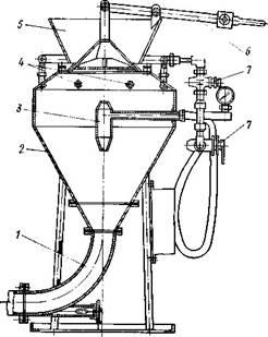 Составляющие заливаются через воронку и перемешиваются сжатым воздухом, который поступает через кран 2, в это время кран 8