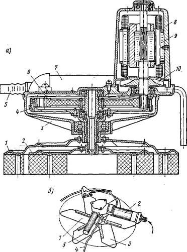 (рис. 12.16) имеет рабочий орган в виде фибрового шлифовального диска / диаметром 200—250 мм, установленного под углом 3° к обрабатываемой поверхности. Такое положение диска предохраняет его от перегрева и обеспечивает лучший отсос пыли вентилятором 5.