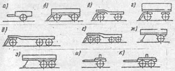 Рисунок 1.2 – Прицепы и полуприцепы: а – одноосный прицеп; б – двухосный прицеп; в – двухосный прицеп-тяжеловоз; г – двухосный прицеп-тяжеловоз с бортами; д – трехосный прицеп-тяжеловоз; е – четырехосный прицеп-тяжеловоз; ж – одноосный полуприцеп; з – двухосный полуприцеп; и – одноосный прицеп-роспуск; к – двухосный прицеп-роспуск
