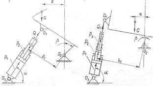 В основном подъемные механизмы оборудованы гидравлическим приводом. Масляный насос приводится от двигателя автомобиля через коробку отбора мощности. Гидроцилиндры подъемных механизмов могут иметь горизонтальное, наклонное или вертикальное расположение. Гидроцилиндры располагаются на раме автомобиля-самосвала под кузовом, в передней части рамы или на переднем борту кузова (рис. 3.1). С изменением угла подъема кузова изменяется угол α наклона цилиндров и плечи (а) и (b) моментов. Таким образом, для каждого угла β подъема кузова усилия Q на штоках выдвижных звеньев и давление (p) в гидроцилиндрах подъемника бут различными. Из уравнения моментов относительно точки О2