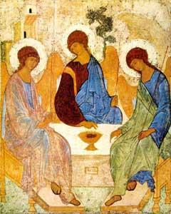 Думается, что именно этот образ (явление трех Ангелов) связан неразрывно с праздником Святой Троицы. Церковь избрала именно эту икону, а не какую-либо иную, не случайно, но потому, что она с наиболее возможной полнотой выражает догматическое исповедание Святой Троицы и, можно сказать, рождена этим исповеданием.