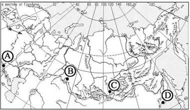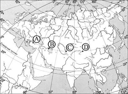 Определите, в какомиз пунктов, обозначенных буквами на карте Евразии, 1 августа Солнце будет находиться ниже всего над горизонтом в 9 часов по солнечному времени Гринвичского меридиана. Запишите обоснование своего ответа.