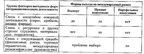 Факторы, определяющие сравнительную выгодность разных форм иностранных инвестиций и экспорта продукции, представлены в табл. 7.1. Ответы «да» и «нет» следует воспринимать как относительную характеристику выгодности приведенных форм по каждому фактору.
