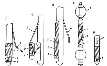 Для исследования нефтяных и газовых скважин, как правило, применяются двухзондовые измерительные установки, экранированные от скважины, с азимутальной коллимацией излучения источника и регистрируемого излучения (рис. 4, а—в).