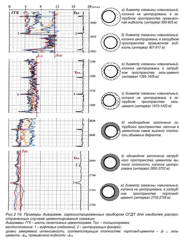 При изучении технического состояния скважин требуется определить: высоту подъема цемента; равномерность заполнения затрубного пространства цементом и его плотность; эксцентриситет колонны; толщину колонны; места установки центрирующих фонарей на обсадной колонне. Для оценки качества цементирования методом ГГК в основном применяются приборы СГДТ (скважинный гамма дефектомер толщиномер) различных модификаций. Принцип работы скважинного прибора заключается в регистрации зондами различной длины рассеянного γ-излучения от одного точечного источника радиоактивного цезия (137