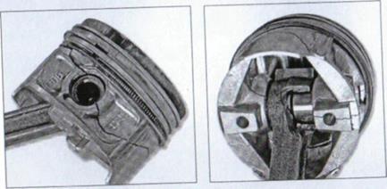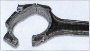 Температурное разупрочнение характерно не только для алюминиевых сплавов, имеющих низкую температуру плавления, но и для стали. В качестве примера на рис. 1.5 показан шатун, подвергшийся деформации при перегреве нижней головки вследствие нарушения подачи масла в зону трения шейки коленчатого вала и вкладышей. На перегрев детали указывает спекание вкладыша с постелью шатуна и наличие обуглившейся пленки масла на поверхностях. Повышенный момент трения в заклиненном сопряжении привел к изгибу шатуна по направлению вращения шейки вала.