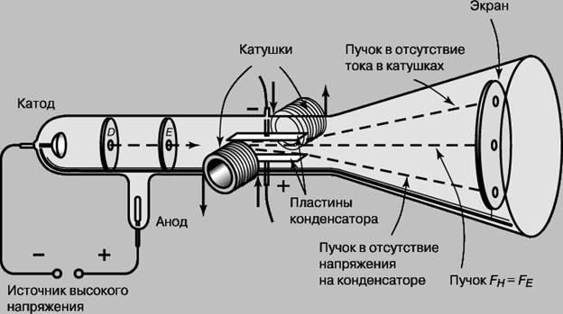 Кроме того, в той же области трубки с помощью пары катушек с током могло создаваться магнитное поле, способное отклонять электроны в противоположном направлении. Сила FH