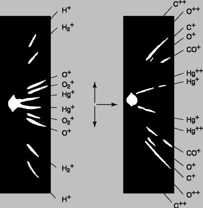 Томсон решил измерить массу и заряд этих новых лучей, также используя для отклонения частиц электрическое и магнитное поля. Его прибор для изучения положительных лучей, «масс-спектрограф», схематически изображен на рис. 2. Он отличается от прибора, представленного на рис. 1, тем, что электрическое и магнитное поля отклоняют частицы под прямым углом друг к другу, а потому «нулевое» отклонение получить не удается. Положительно заряженные атомы на пути между анодом и катодом могут потерять один или несколько электронов, и по этой причине могут ускоряться до различных энергий. Атомы одного типа с одинаковыми зарядом и массой, но с некоторым разбросом конечных скоростей, вычертят на люминесцентном экране или фотопластинке кривую линию (отрезок параболы). При наличии атомов с различной массой более тяжелые атомы (с тем же зарядом) будут отклоняться от центральной оси слабее, чем более легкие. На рис. 3 приведена фотография парабол, полученных на масс-спектрографе Томсона. Самая узкая парабола соответствует самому тяжелому однократно ионизованному атому (атому ртути), у которого выбит один электрон. Две самые широкие параболы соответствуют водороду, одна – атомарному H+